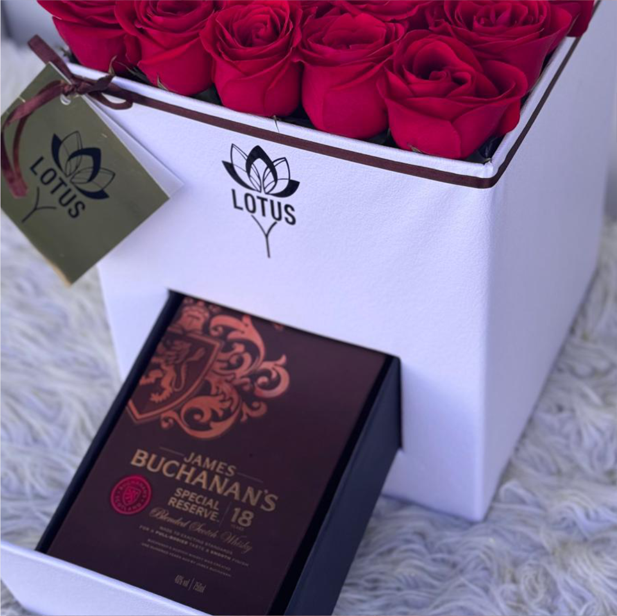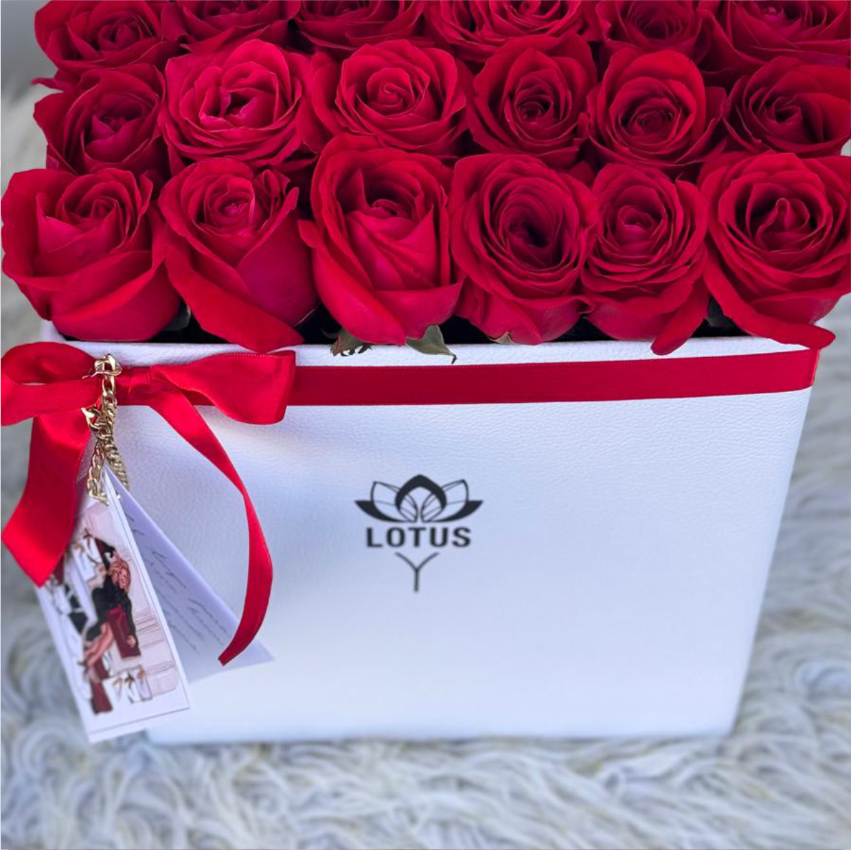 Cada caja está cuidadosamente diseñada con 30 rosas naturales frescas y un espacio especial para dulces o chocolates, creando una experiencia visual y gustativa que enamora.