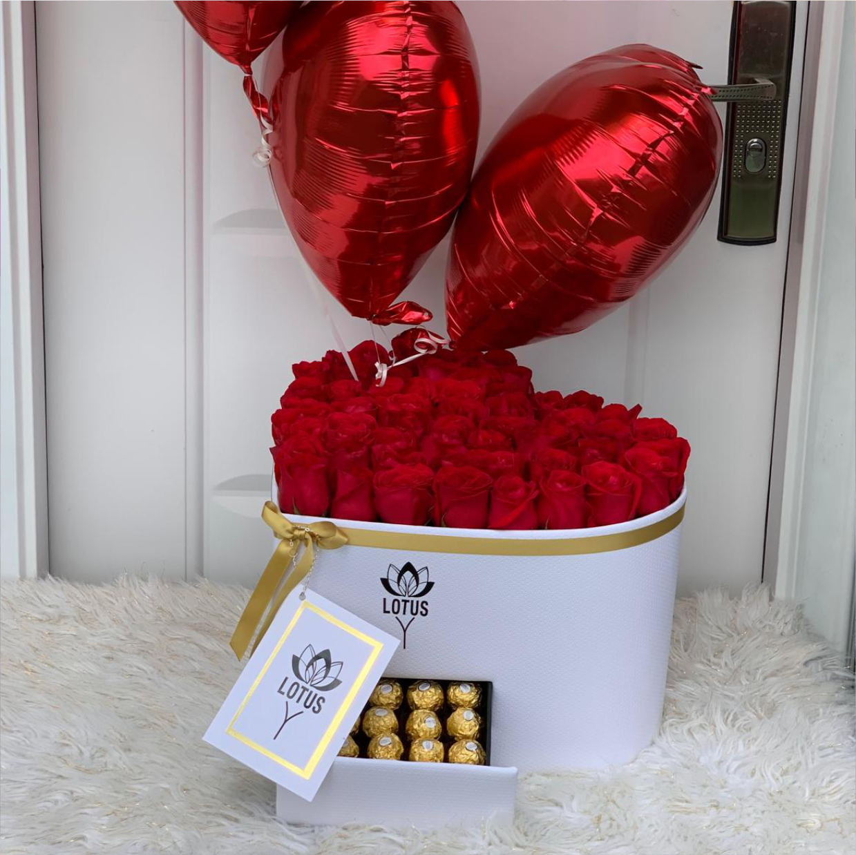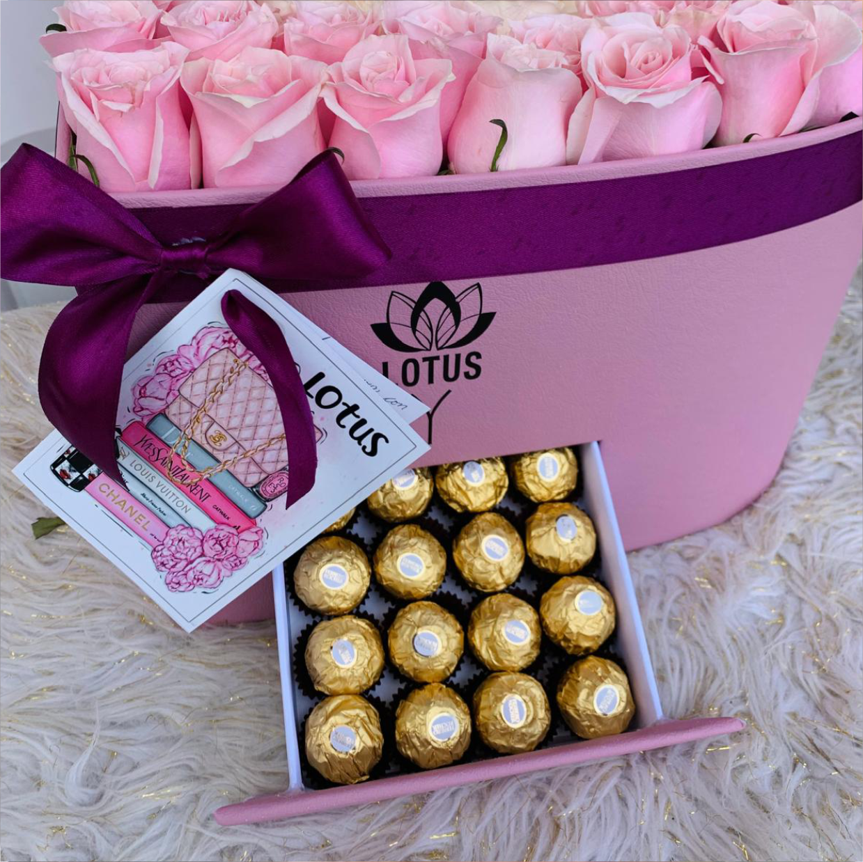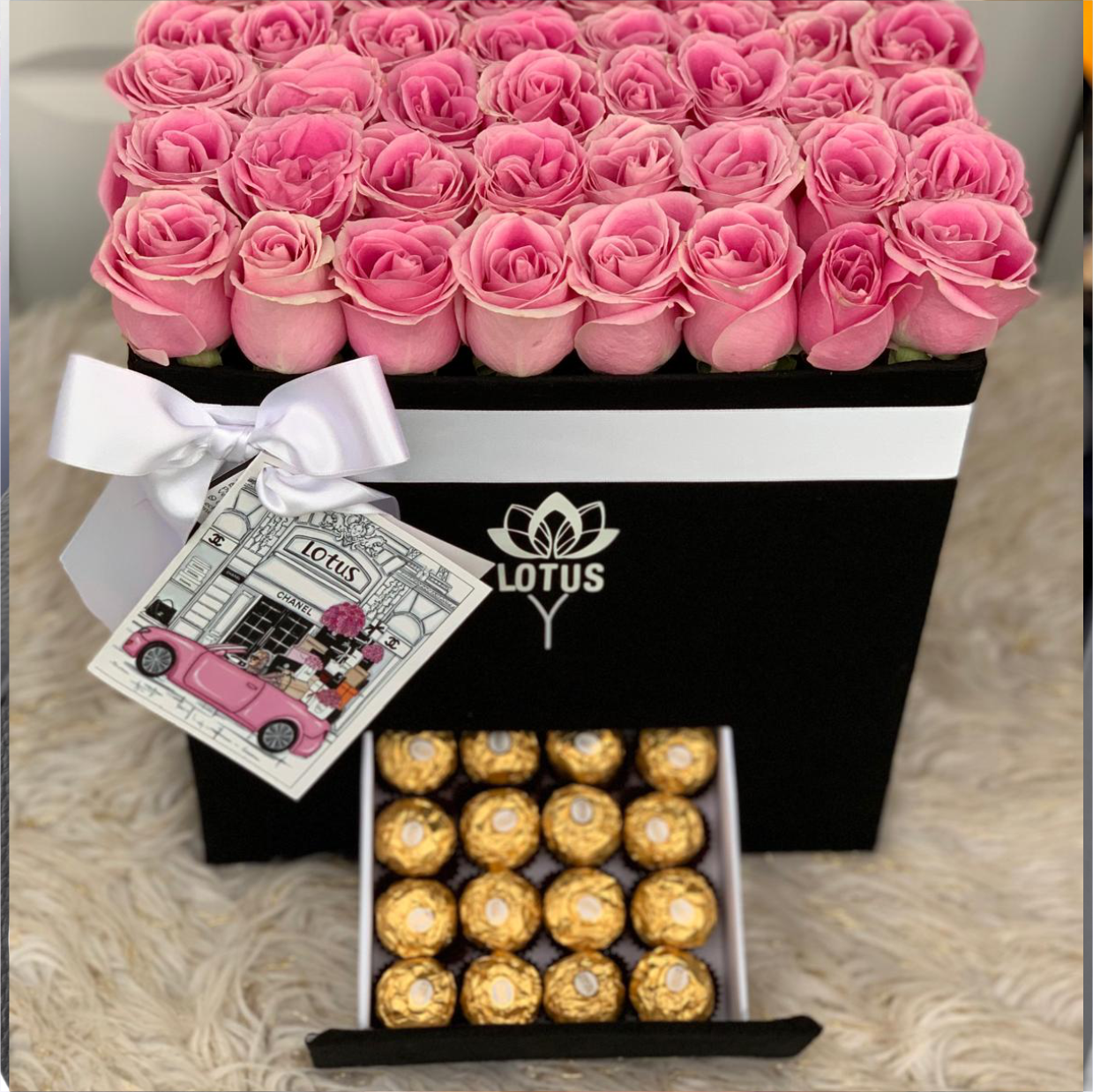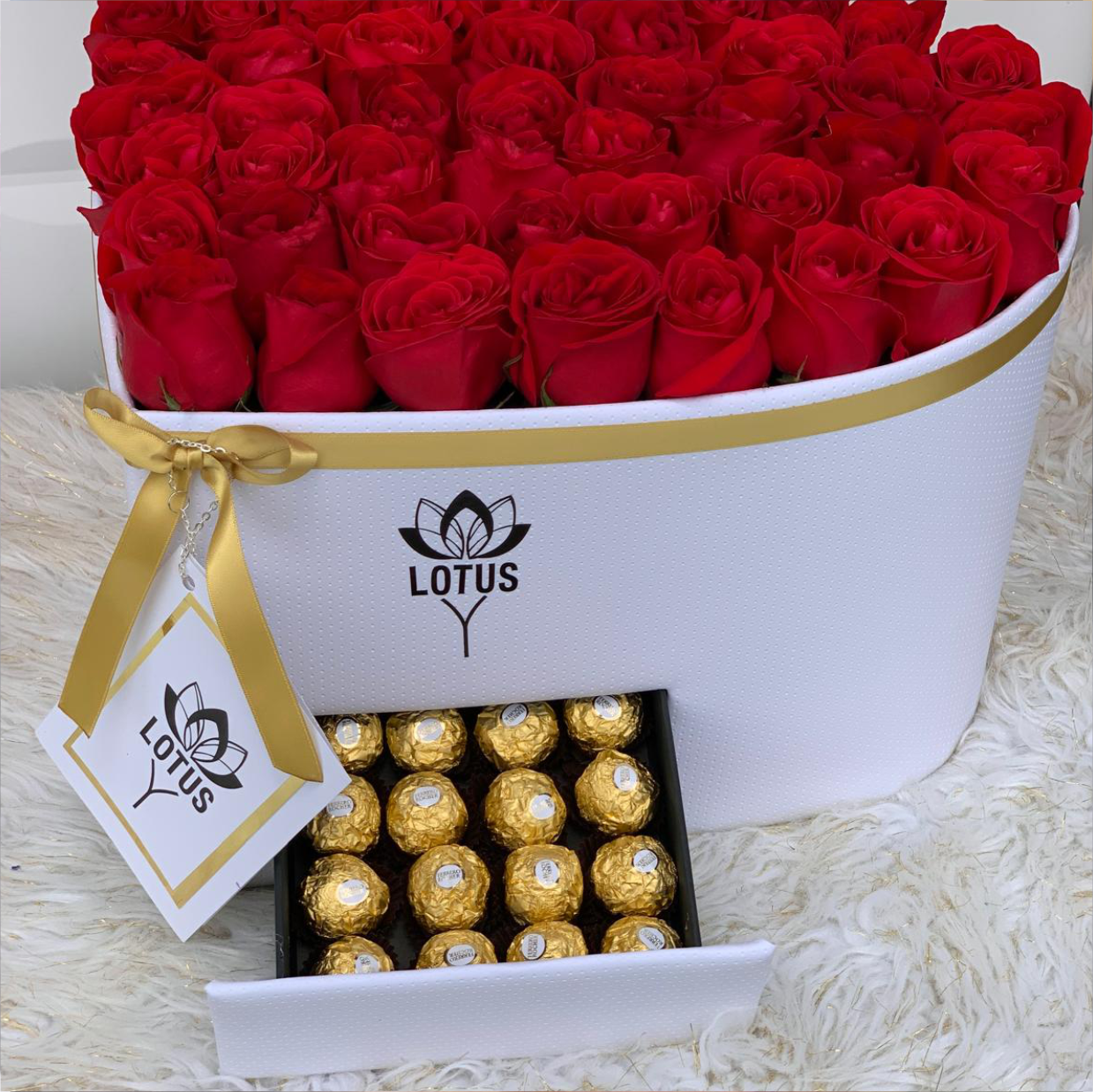 Cada caja está cuidadosamente diseñada por nuestros floristas, combinando 50 rosas frescas con chocolates Ferrero Rocher originales, creando un equilibrio perfecto entre belleza floral y dulzura irresistible.