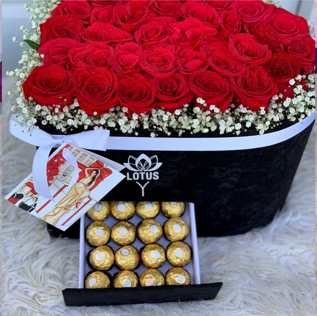 La Colección de Cajas con 50 Rosas y Ferrero Rocher es la expresión más sofisticada de romance y exclusividad.