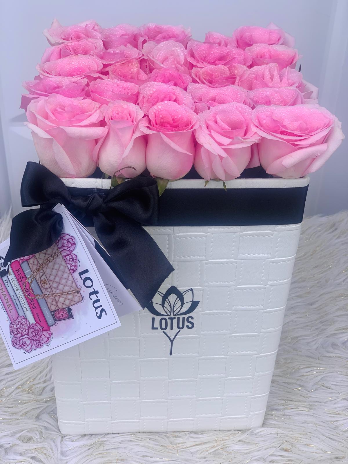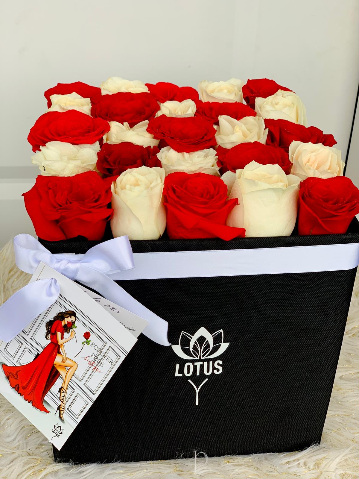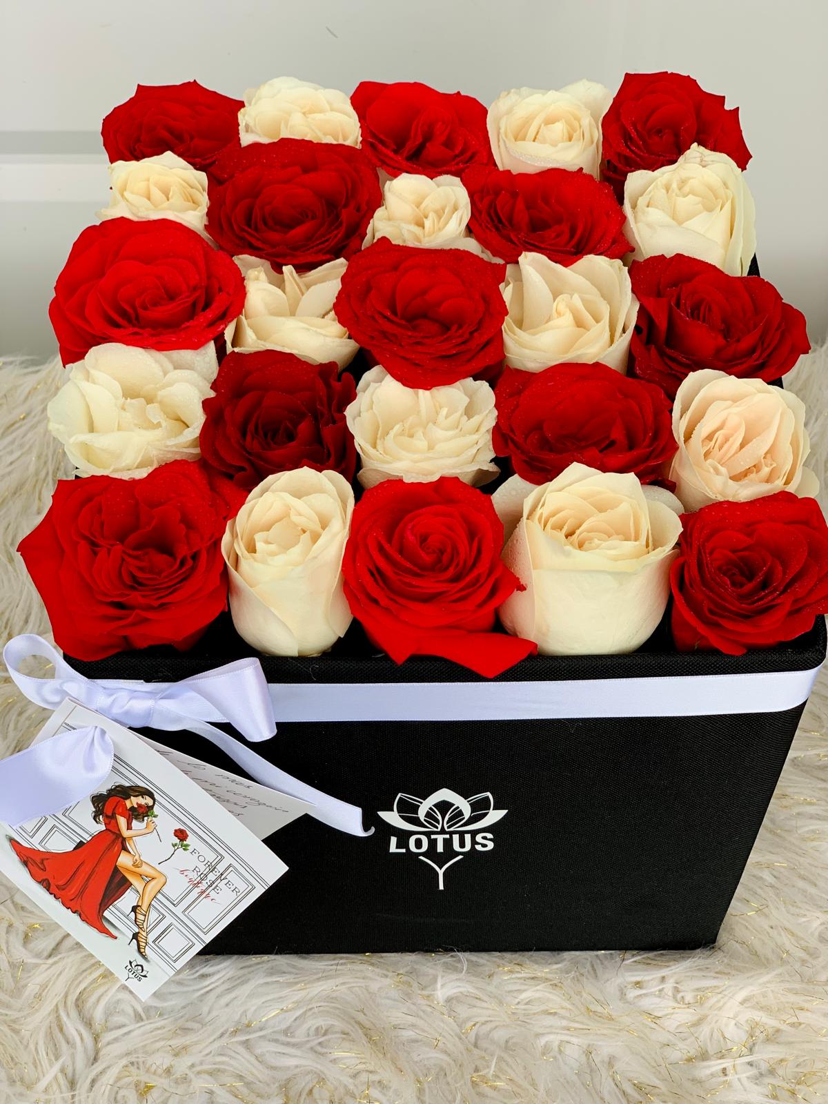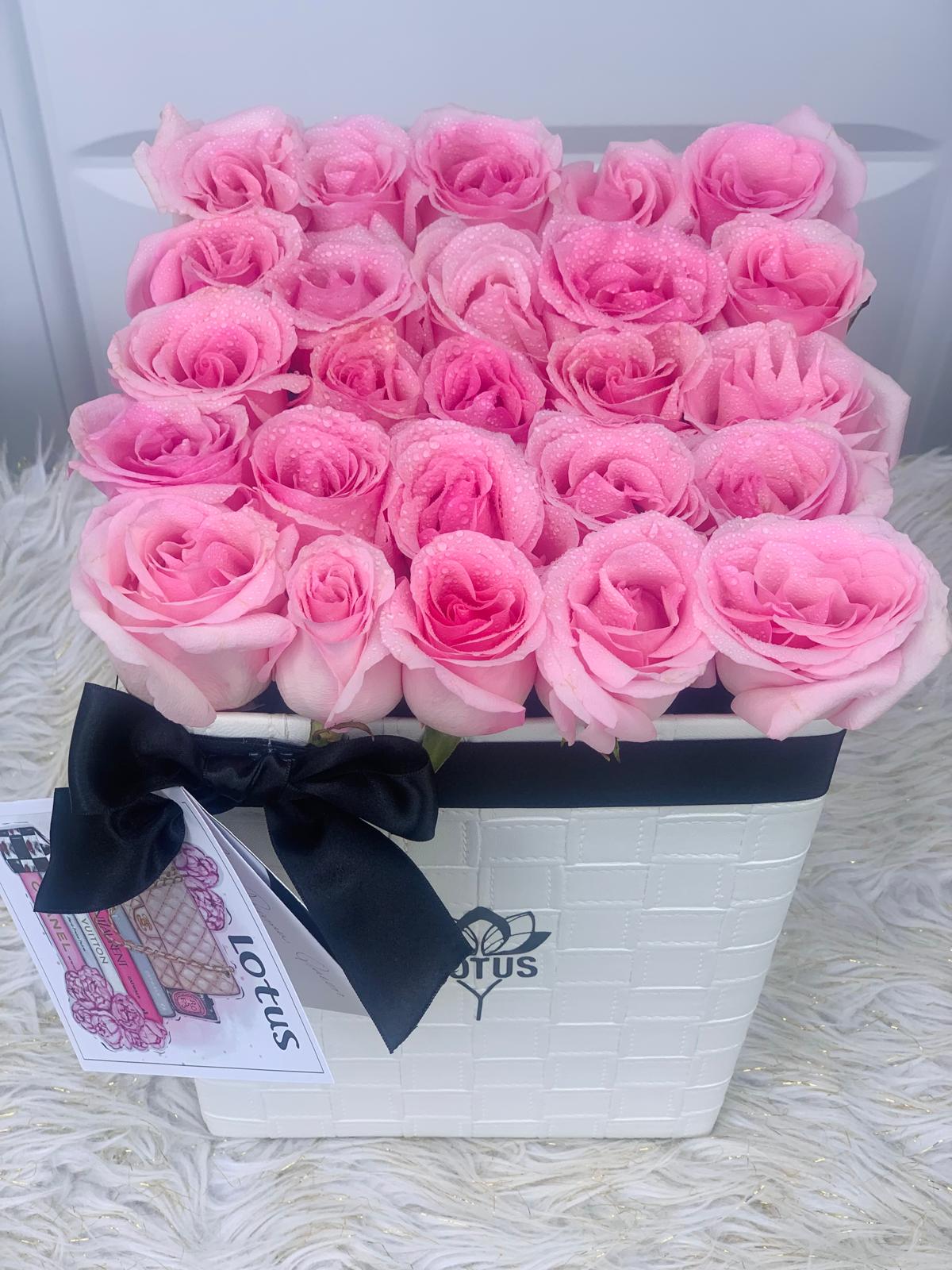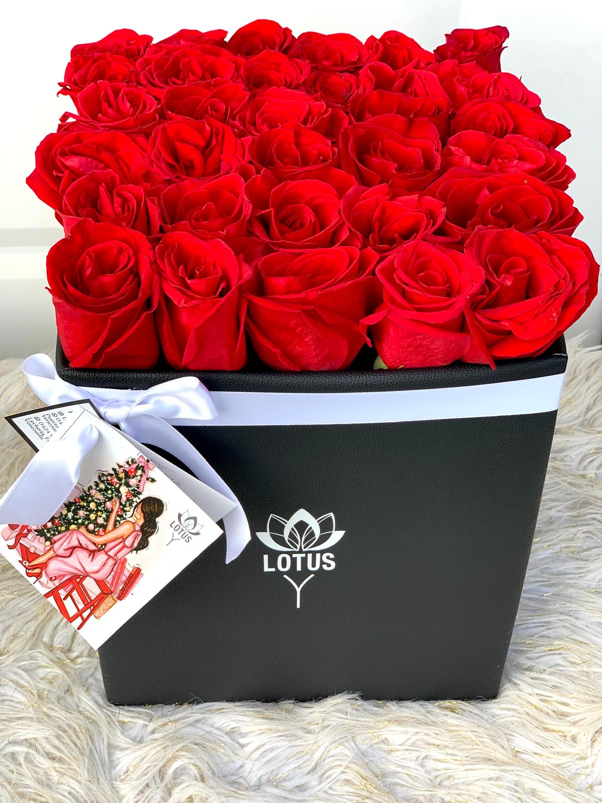Disponibles en formato cuadrado o redondo, cada caja es elaborada con materiales premium y contiene 25 rosas naturales seleccionadas por nuestros floristas para garantizar frescura y belleza duradera.