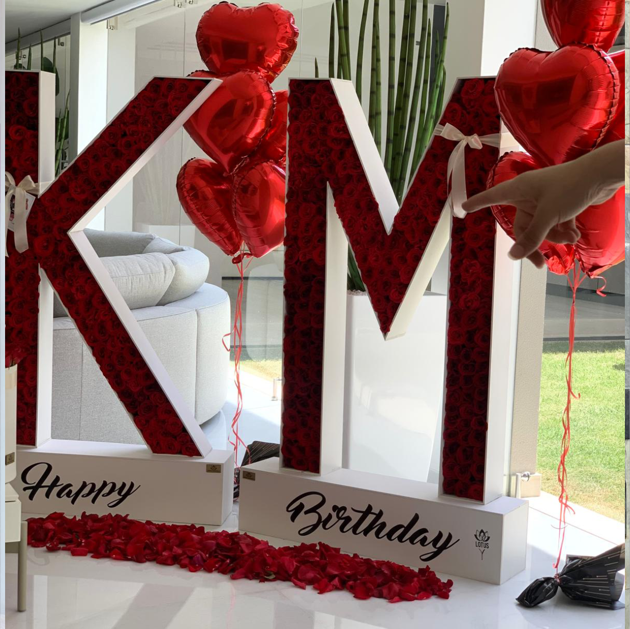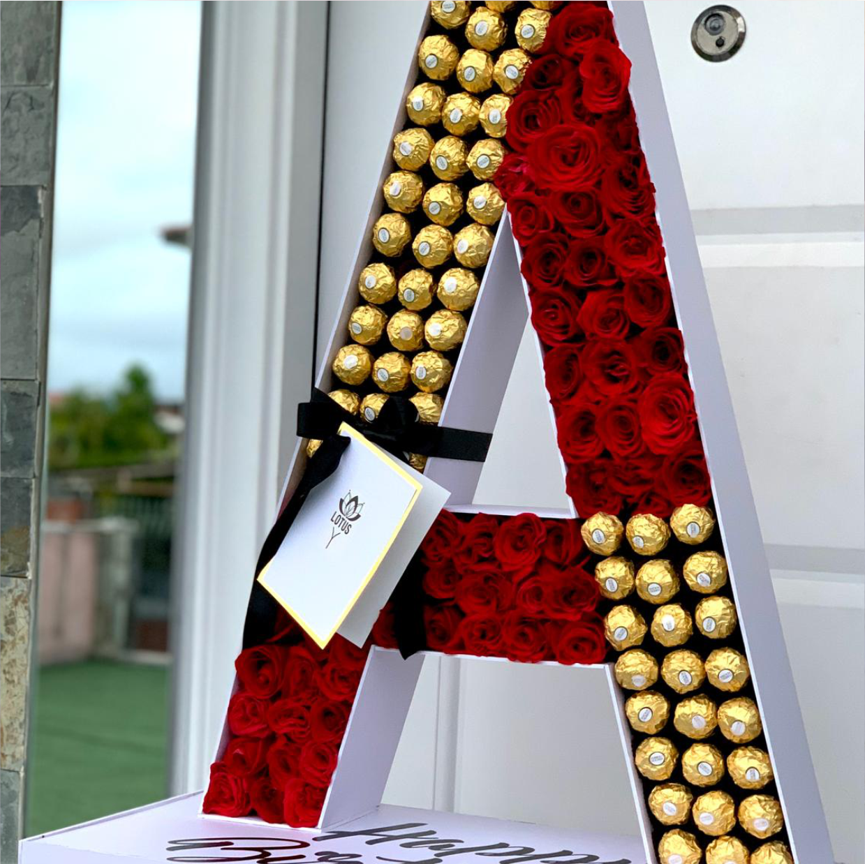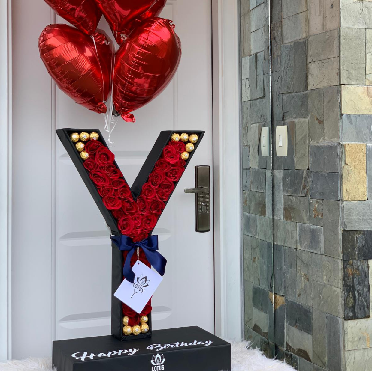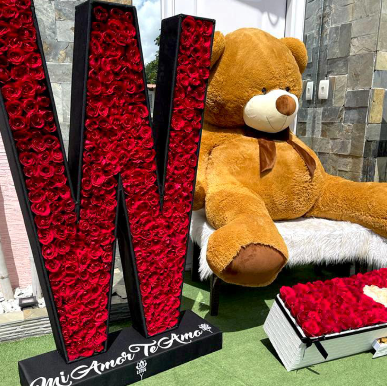 Crea un regalo impactante y memorable con nuestras letras de rosas de 1.40 metros, cuidadosamente elaboradas con rosas frescas y montadas sobre una base personalizada. Cada arreglo incluye deliciosos chocolates Ferrero Rocher y 5 globos de helio, creando un detalle elegante, romántico y festivo.